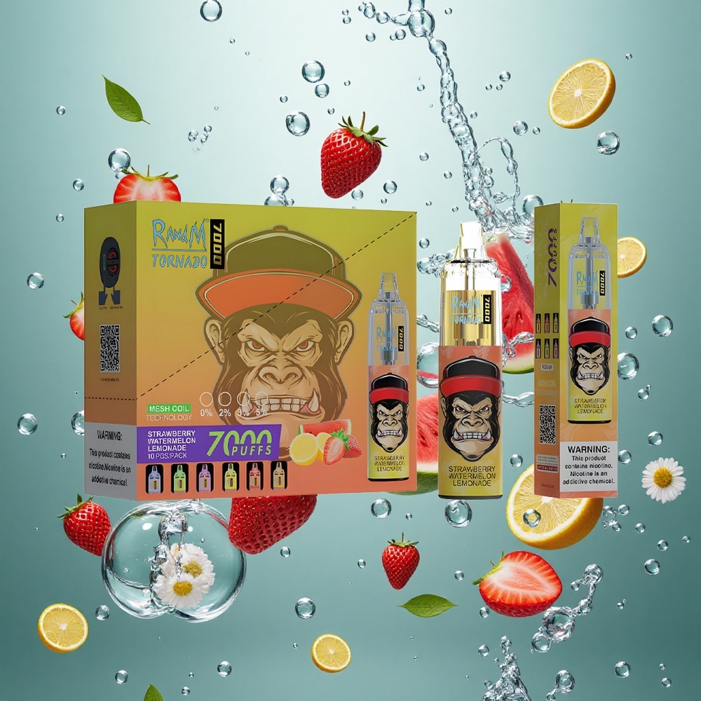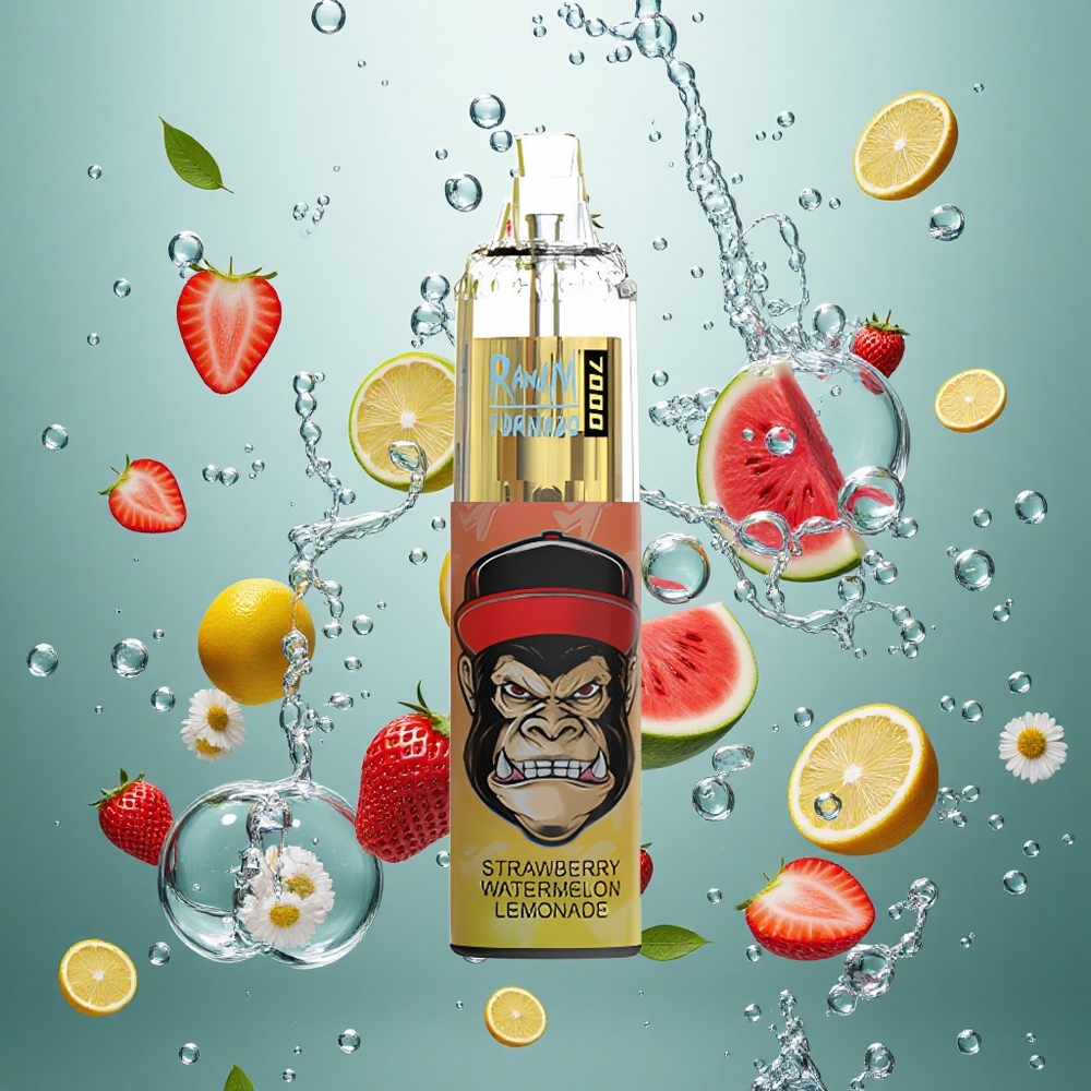 RandM Fumot Tornado 7000 Puffs Eldobható E-cigaretta Eper-Görögdinnye Limonádé 14 ML E-liquiddel, Légáramlás-Szabályozó