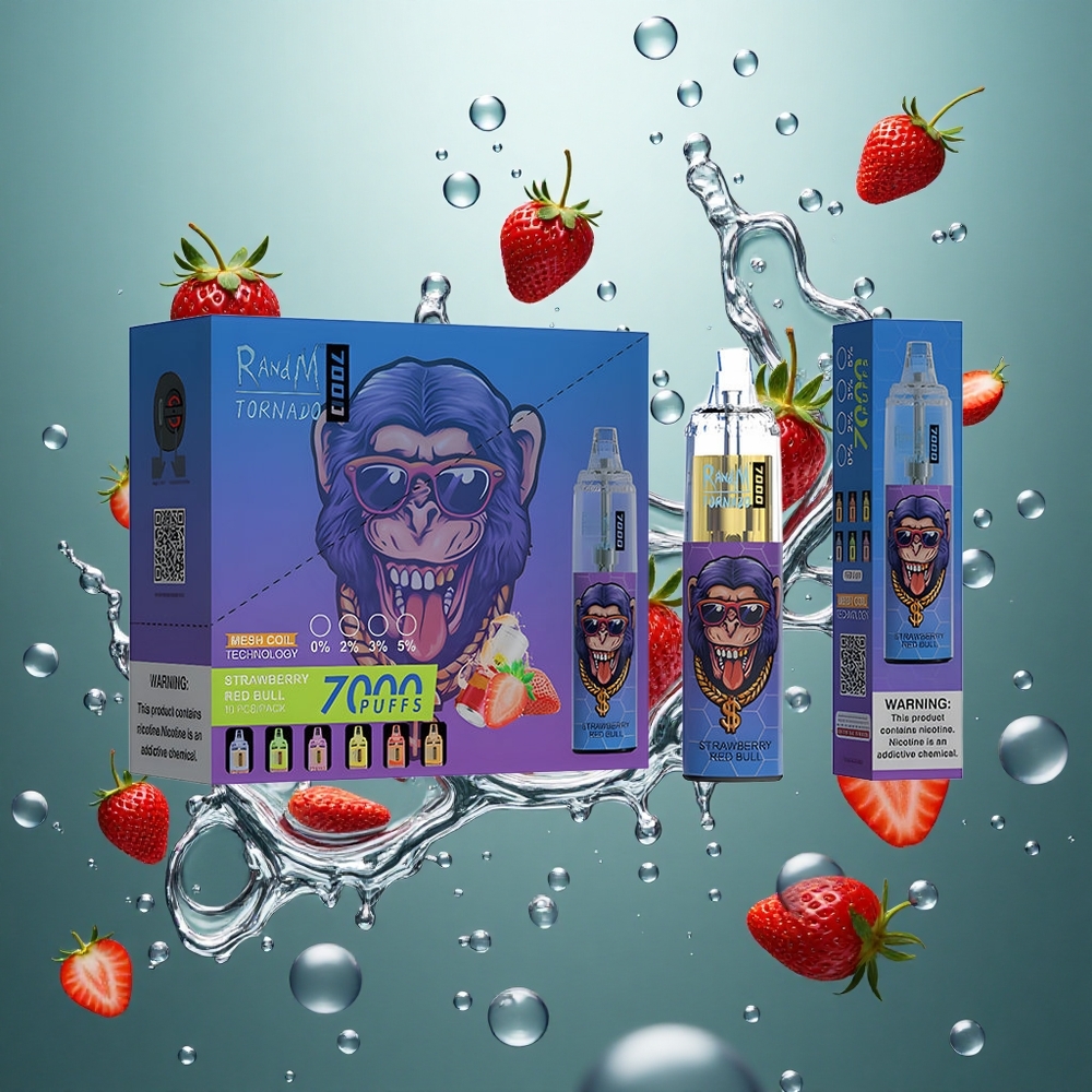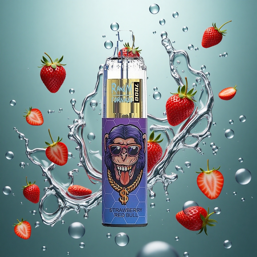 RandM Fumot Tornado 7000 Puffs Eldobható E-cigaretta Eper Red Bull Ízű, 14 ML E-liquiddel, Légáramlás-Szabályozó